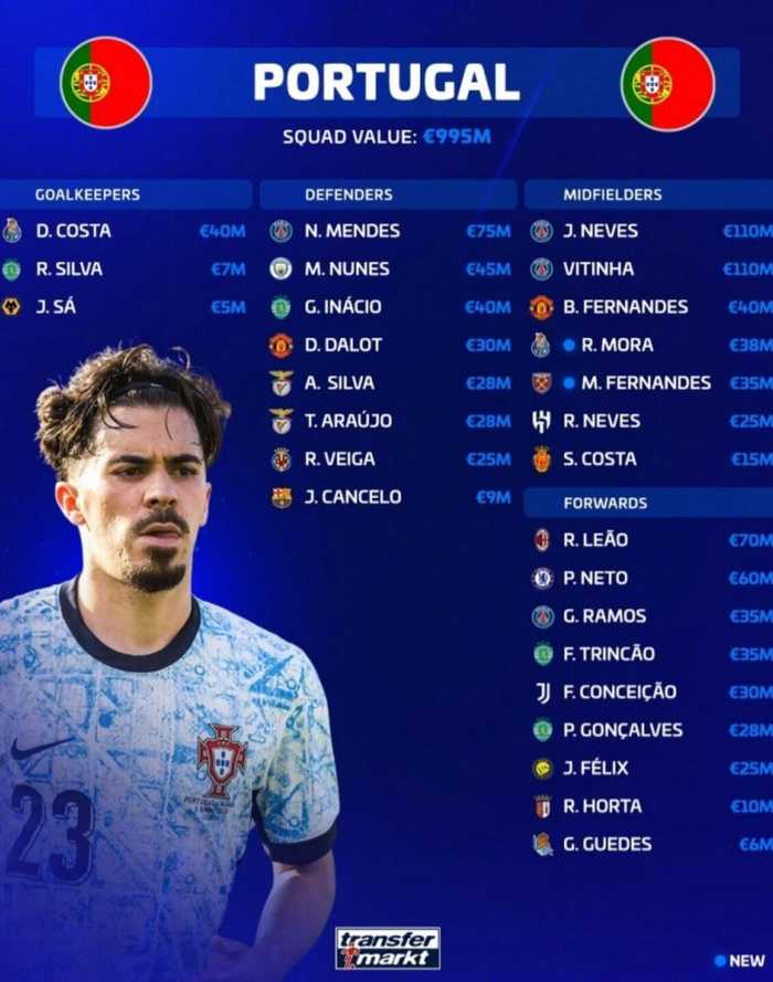 据德国转会市场统计,最新一期葡萄牙国家队名单上的球员身价总计9.95亿欧元,详细情况如下: